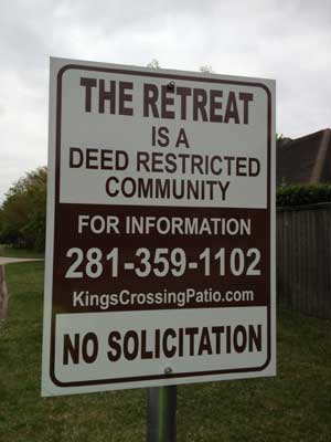 | In an effort to prevent solicitors from coming into the village, the Board of Directors has placed new signs stating "No Solicitation". The signs also point out that Deed Restrictions are in place for the community. | ![]() |